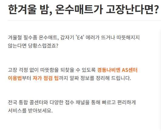 경동나비엔 온수매트 고장 시 빠르고 정확한 AS 신청 방법을 안내합니다. 고객센터 연락처부터 온라인 접수까지 편리한 방법을 확인하세요.