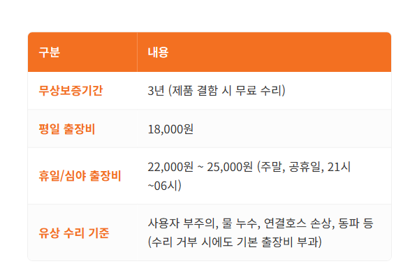단, 소비자 과실이나 설치 후 이동으로 인한 고장은 무상 기간 내라도 유상 처리됩니다. 무상 기간 경과 후에는 출장비와 부품비가 발생합니다.