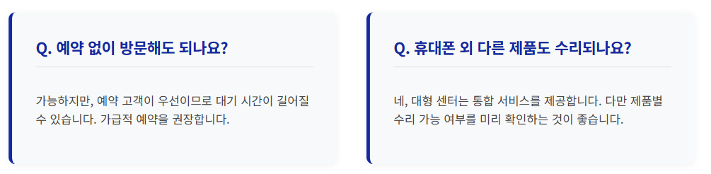제품 모델명, 고장 증상, 구매 영수증(보증기간 확인용)을 미리 준비하면 접수가 빨라집니다. 휴대폰 수리 시 데이터 백업도 필수입니다.