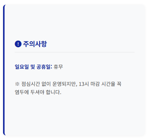 토요일은 오전 9시부터 오후 1시까지만 운영되므로, 늦게 가면 접수조차 어려울 수 있습니다. 오전 9~10시에 방문하는 것을 권장합니다.