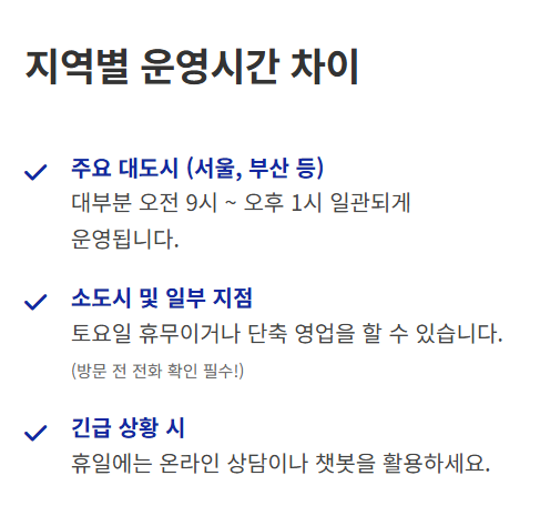 대부분의 센터가 토요일 오전(09:00~13:00)에 운영되지만, 일부 소규모 센터는 휴무일 수 있습니다. 방문 전 홈페이지나 전화로 확인하세요.