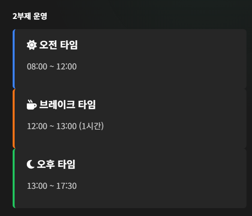 • 휴게시간: 낮 12시 ~ 오후 1시