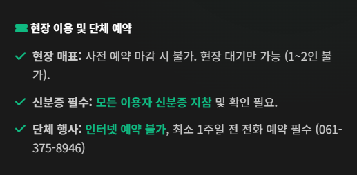 예약일에 20명 미만으로 방문할 경우 예약이 자동 취소되며 선착순 현장 접수로 전환됩니다.