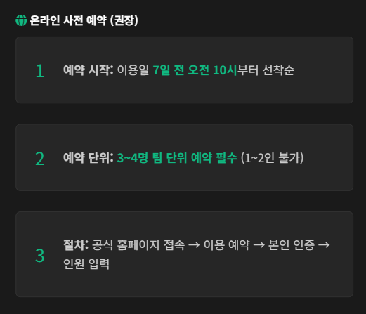 미리 시간대를 확보할 수 있어 원하는 시간에 확실히 이용 가능합니다. 특히 주말이나 성수기에는 온라인 예약을 권장합니다. 하루 입장 인원은 오전·오후 각 200명씩 총 400명으로 제한됩니다.