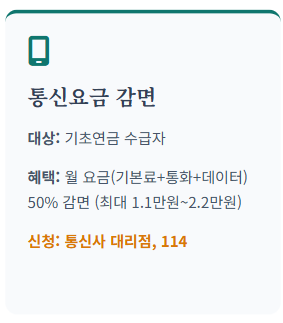 기초연금 수급자는 휴대전화 요금의 50%를 감면받을 수 있습니다. (월 최대 2.2만원 한도) 통신사 또는 주민센터에서 신청 가능합니다.