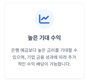 상품 유형에 따라 연 3~8% 수익률을 목표로 합니다. 시중 예금 금리(2.5~3%)보다 높은 수익을 기대할 수 있습니다.