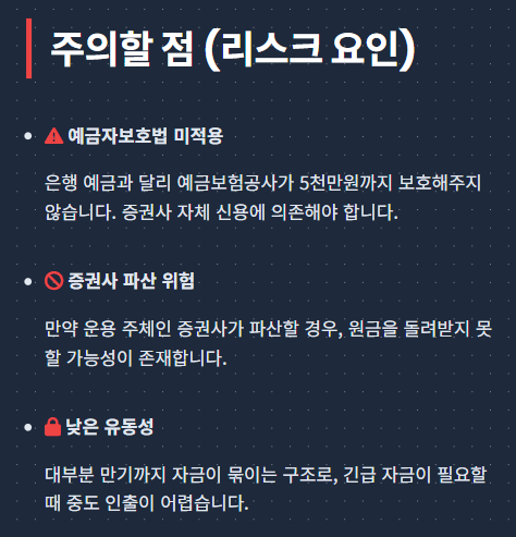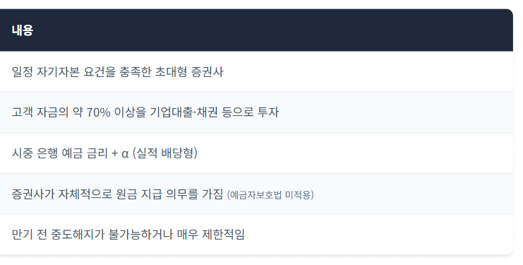예금보다 높은 수익률을 기대할 수 있습니다. 원금 지급 의무 구조로 일반 투자상품보다 안정적입니다. 자기자본 8조원 이상 대형 증권사만 취급해 신뢰도가 높습니다.